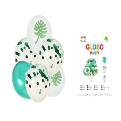 Pack of 15 balloons: five green balloons, five white balloons with a drawing of a leaf and 5 transparent balloons with green confetti inside. Resistant and reusable material, suitable for air, stickers and self-closing included.