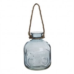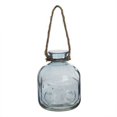 Blue circular vase with the phrase "Life is a beautiful ride" and a bicycle drawing. Also includes a handle made of country-style rope.