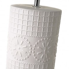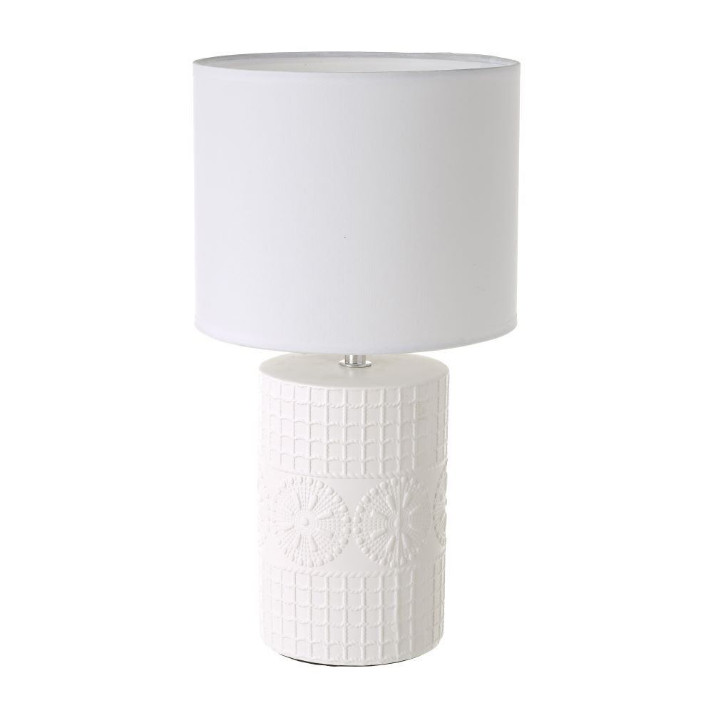 White lamp. The lower part is made of ceramic with relief and details in the shape of circular flowers.