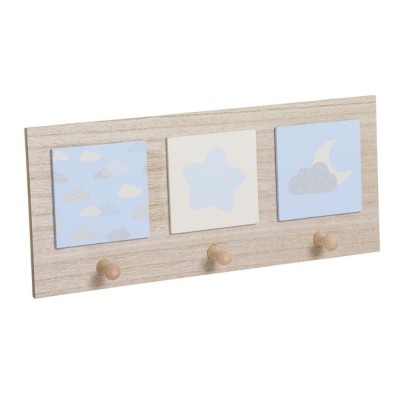 Wooden coat rack with pastel blue and yellow details. Coat rack consisting of 3 hangers with a cloud, star or moon drawing on the top of each hanger. Two models available.