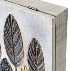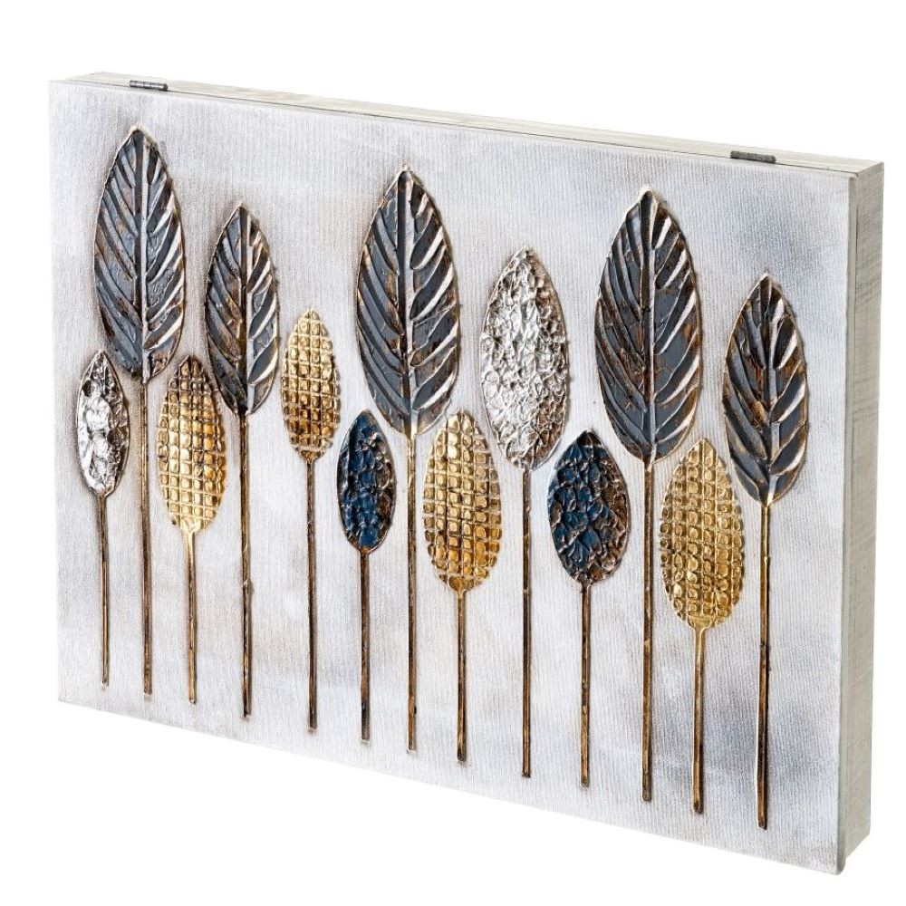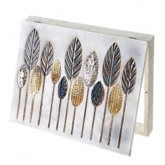Counter cover with tree drawings in textured gold, gray and blue tones.