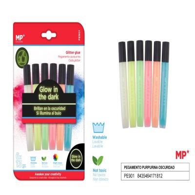 Set of 6 glitter glues, intense colors, glow in the dark.