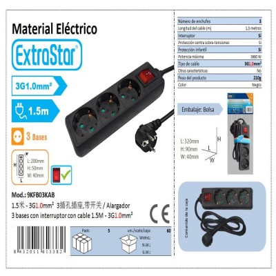 Extension cord with 4 bases with switch with cable 5.0 M.