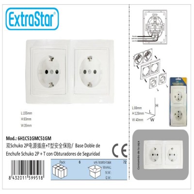 Double 2P + T Schuko socket base with safety shutters.