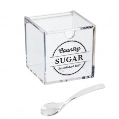 Transparent sugar bowl with spoon and black detail on the front that includes the message of: Country, Established 1892 and Sugar, with a circular detail. Country collection available.