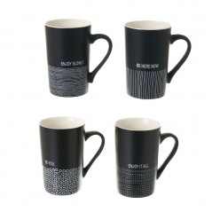 Matte black mug with white dotted line detail and "Enjoy it all" text. Four models and two colors available.