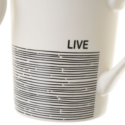 Matte white mug with detail of white horizontal lines and "Live" text. Four models and two colors available.