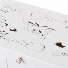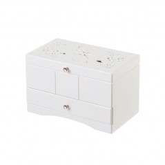 White wooden jewelry box, includes four divisions and a division for rings. It also includes a drawer at the bottom.