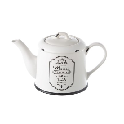 White teapot with black details on the bottom and center front. It includes a text that says "Paris, Maison de famille, Tea, since 1840". Collection available.