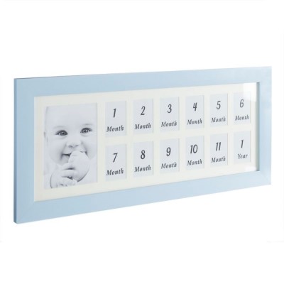 Multiple photo frame that can include twelve photos, one per month. Blue color photo frame with white details.