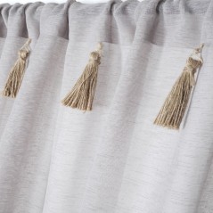 Gray veil style curtain with brown fringe detail on the top. Two colors available.