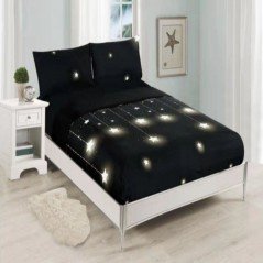 Set of sheets composed of 3 pieces. Black color with white star print. Different sizes available. Contains one pillowcase (45X110 CM), a countertop (160X270 CM) and an adjustable bottom sheet (90X200 CM).