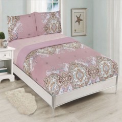 Set of sheets composed of 4 pieces. Pink color with mandala style print. Different sizes available. Contains two pillowcases (50X75 CM), a countertop (230X270 CM) and an adjustable bottom sheet (150X200 CM).