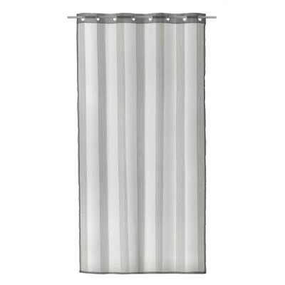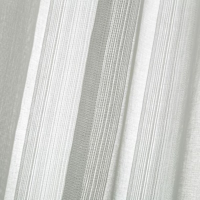 Blue curtain with linear details formed by threads. Curtain made up of 8 chrome rings.