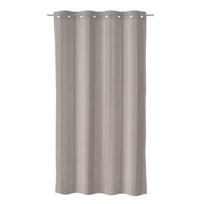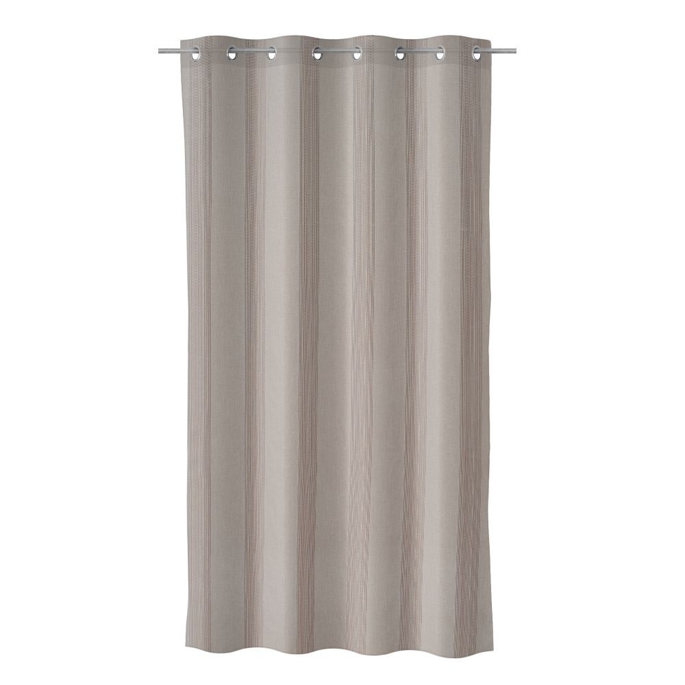 Brown curtain with linear details formed by threads. Curtain made up of 8 chrome rings.