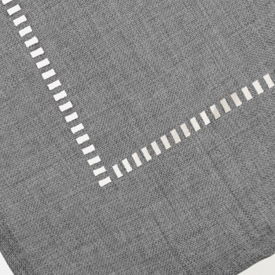 Gray tablecloth with details at the bottom. Different colors available. It does not allow bleach or tumble drying. It does not support dry cleaning. Maximum ironing at 110º.