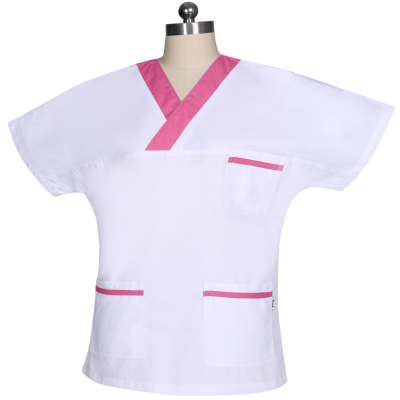 White uniform dressing gown with pink details on the collar and front pockets. Three models available.
