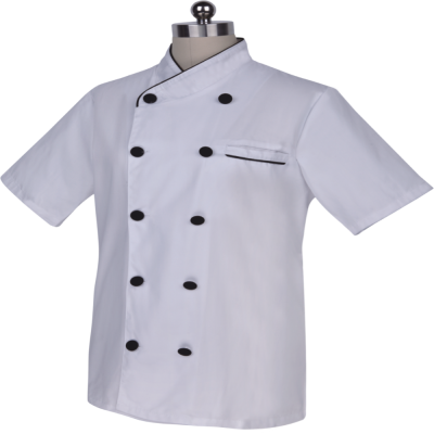 White kitchen jacket with black details on the collar and double black buttons. Easy care garment.