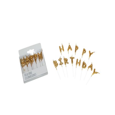 Single use gold "Happy Birthday" birthday candles.