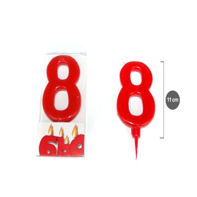 Red birthday candle, number 8, large size.
